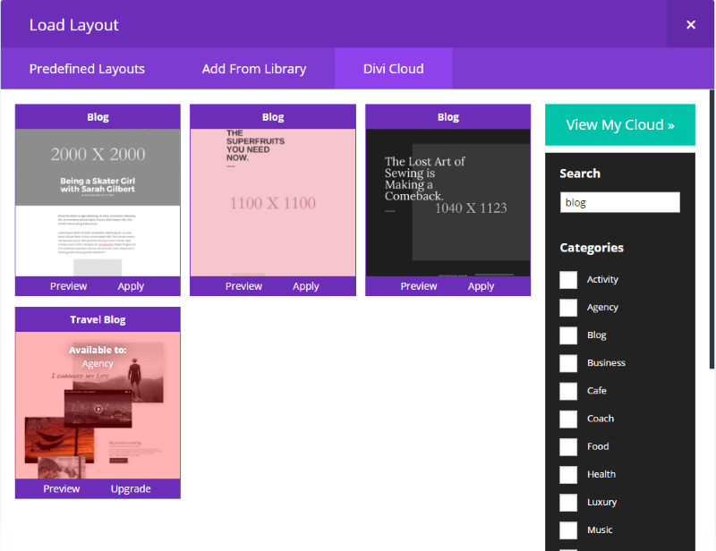 In this example I searched for blog but did not include any categories. Lots of categories could include a blog so I might want to be more specific. Also, the search will return layouts that are not available in my subscription. As more developers add their products to Divi Cloud these results will be much harder to sort through. To filter the results, it’s best to select categories that you want to see results for.