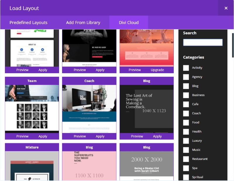 Divi Cloud includes a search to make it easier to sort through the layouts. Simply type the topic into the search box and click Search. If there are too many to look through you can narrow your search down by selecting the categories you want. It currently includes 16 categories plus you can search for layouts that are only available to you.