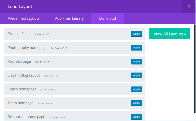 To access the layouts in your Divi Cloud select Load from Library, Divi Cloud, and then click View my Cloud. Choose the layout you want and select Apply. The layout will appear within the Divi Builder. The layouts include the name and date with time that you saved the layout. Select View All Layouts to return to the main Divi Cloud screen.