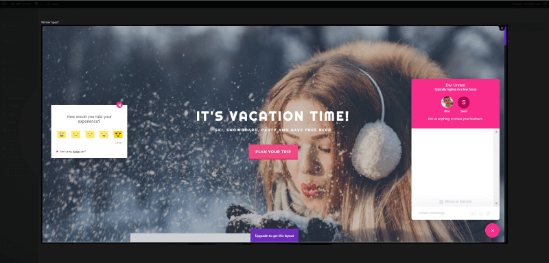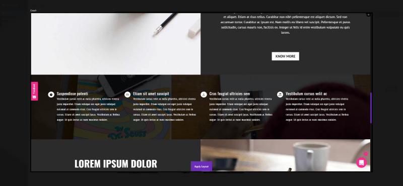 Select Preview to see the layout in a larger screen. Here you can scroll through the layout. The layout’s name is shown in the upper left corner. Click the x in the upper right corner to close the layout. Click Apply Layout (the purple button in the button center) to add the layout to your current page or post.