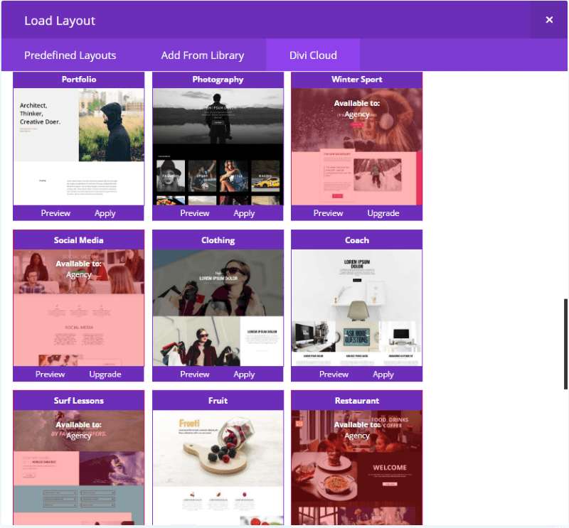 As you can see in the screenshot above, if the layout isn’t included in your subscription the purple button’s caption will be Upgrade to get this layout. Clicking this button will take you to the Divi United website where you can change your subscription.