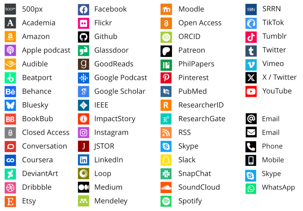 500px | Academia | Amazon | Apple Podcast | Audible | Beatport | Behance | Bluesky | BookBub | Closed Access | The Conversation | Coursera | DeviantArt | Dribbble | Email (2 icons) | Etsy | Facebook | Flickr | Github | Glassdoor | Goodreads | Google podcast | GoogleScholar | IEEE | Impactstory | Instagram | JSTOR | LinkedIn | Loop | Medium | Mendeley | Moodle | Open Access | ORCID | Patreon | PhilPapers | Phone, mobile | Phone, landline | PubMed | Pinterest | ResearcherID | ResearchGate | RSS | Skype | Slack | Snapchat | Soundcloud | Spotify | SSRN | TikTok | Traxsource | Tumblr | Vimeo | WhatsApp | YouTube | X (formerly Twitter)