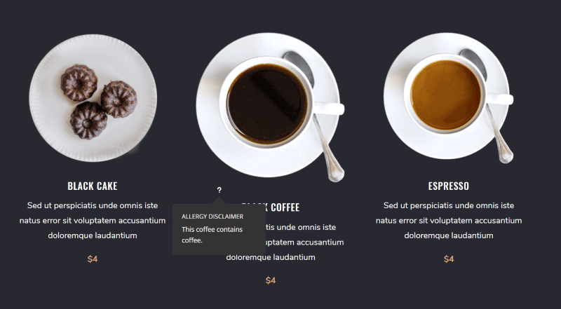 Divi Image Hotspot also works with Extra. Here’s a look at the Coffee Shop with nutrition information in the tooltip.